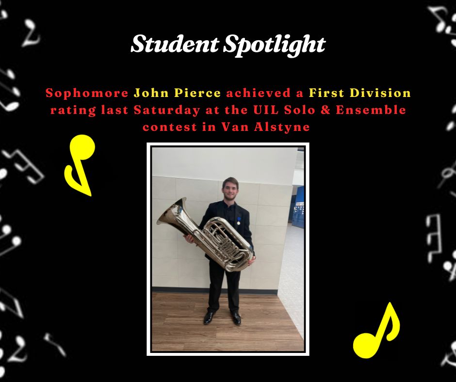 Congratulations to John Pierce for making a first division rating on his tuba solo at the Solo and Ensemble contest on Saturday!